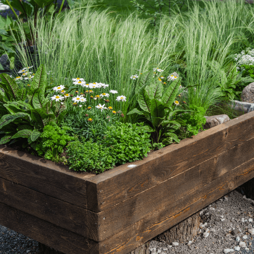 FSC-certified raised planter box for growing flowers, herbs, and berries sustainably.
